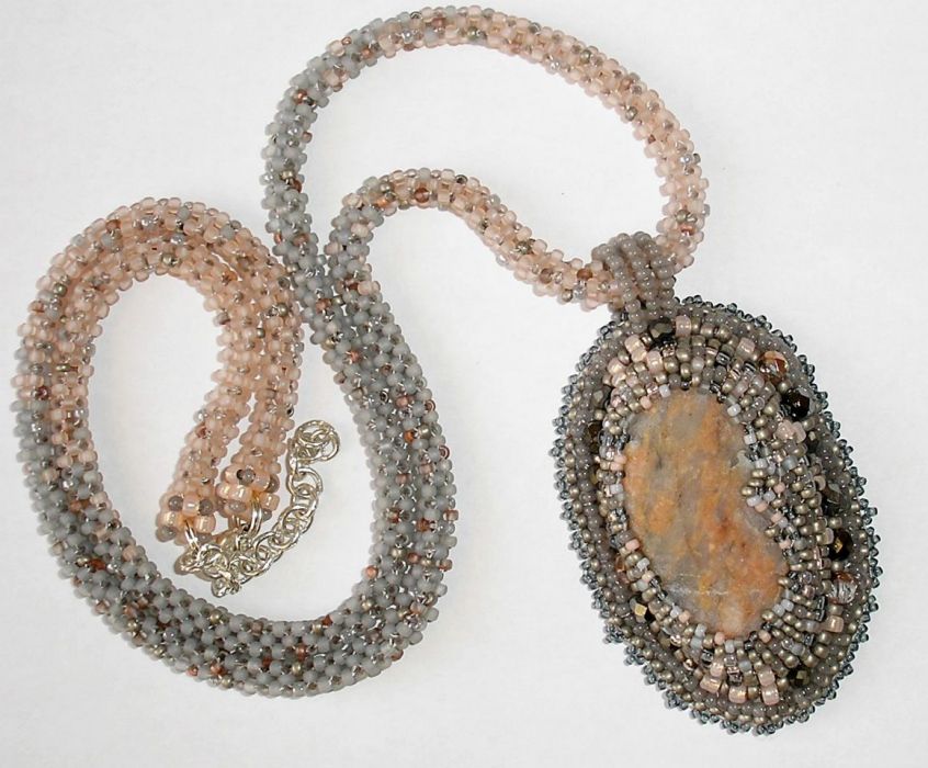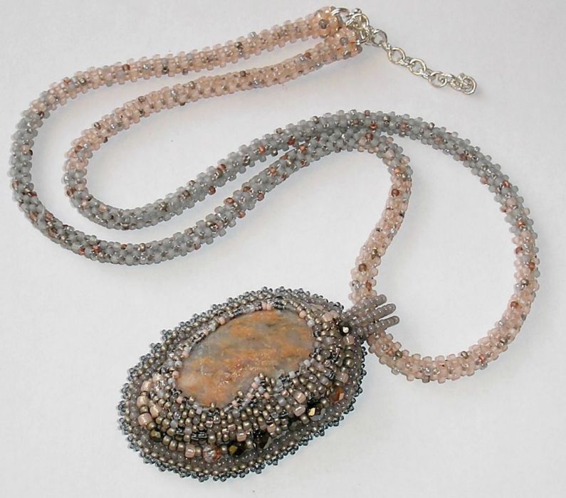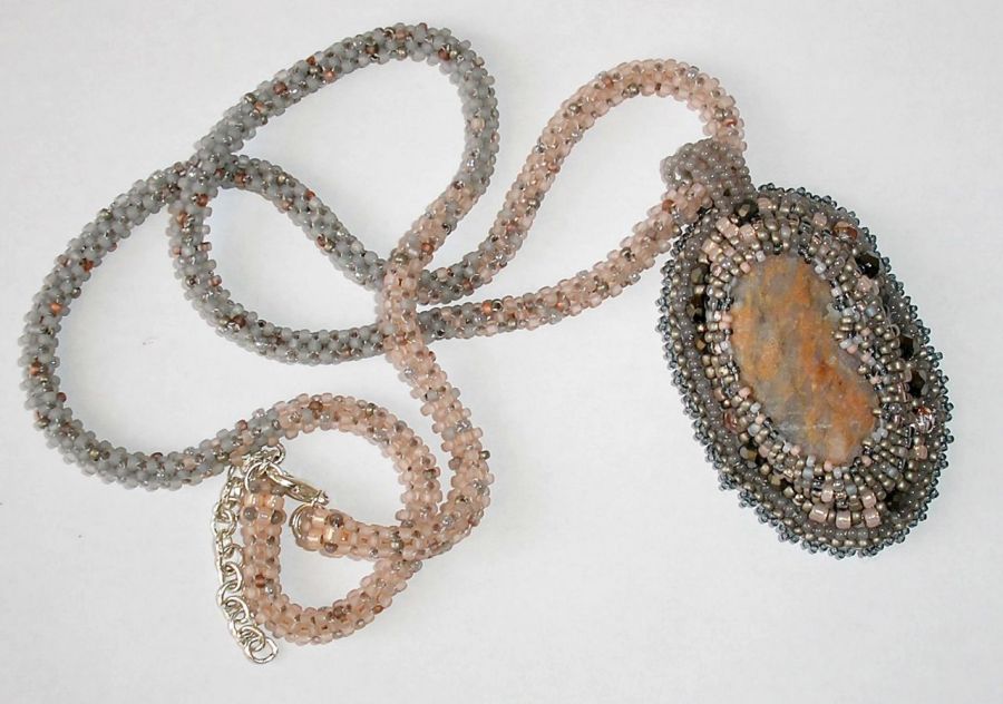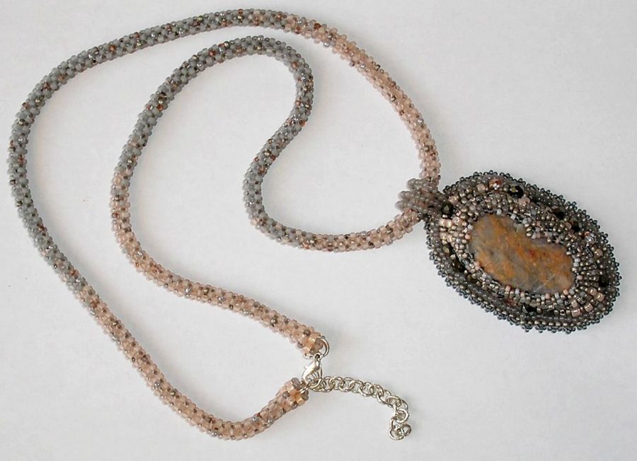 Melanż kolorów szarych i łososiowych doskonale współgra z kolorystyką kamienia. Tył wisiora podszyty popielatym Super Suede. Sznur cieniowany - koraliki szare przechodzą płynnie w łososiowe - wygląda pięknie nawet bez zawieszonego wisiora i można go nosić oddzielnie. Jest dość długi jak na tego typu prace, bo ma prawie 60cm, a z łańcuszkiem regulacyjnym ok. 65cm.
