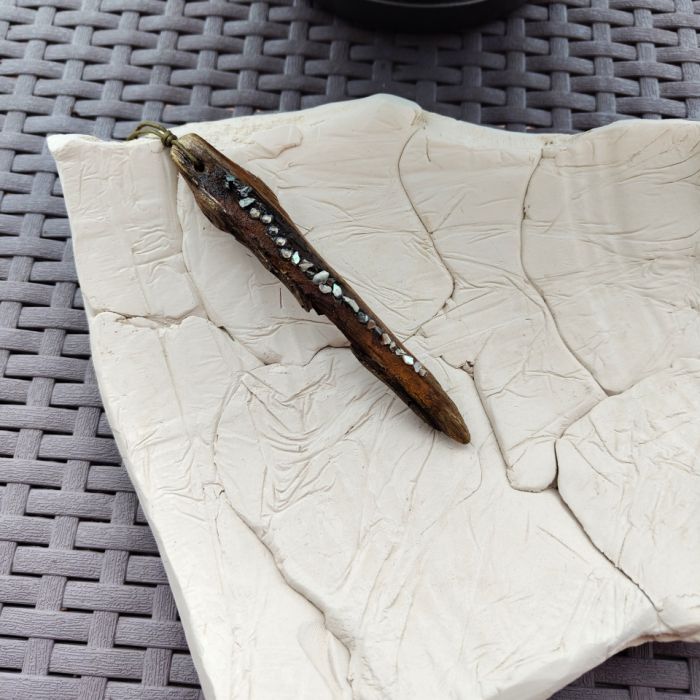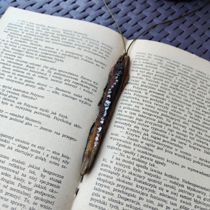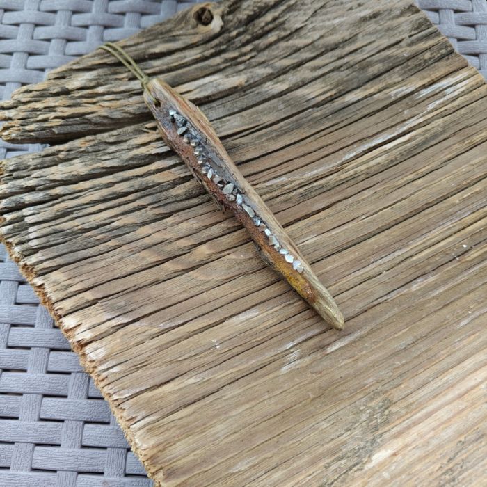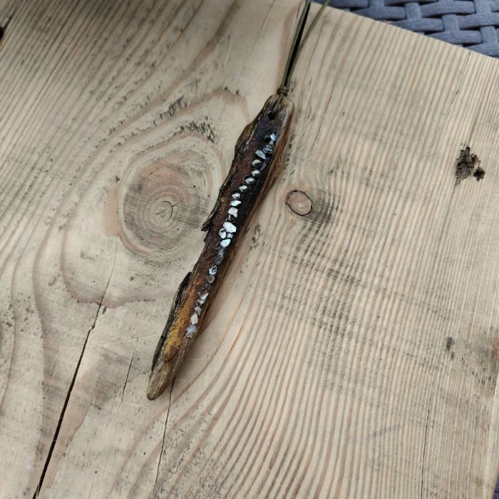 Ten piękny wisiorek został wykonany w technice driftwood, czyli z naturalnego, wyrzuconego na brzeg morza Bałtyckiego drewienka. Każdy egzemplarz jest unikalny, bo opowiada swoją własną, morską historię. Drewienko zdobią delikatne mieniące się w świetle kamyczki, które dodają mu świeżości i odrobiny morskiego klimatu. Całość zawieszona jest na miękkim, bawełnianym sznurku, zakończonym praktycznym zapięciem na karabińczyk, dzięki czemu jest wygodny i łatwy w noszeniu. To nie tylko piękna biżuteria, ale też mały kawałek natury, który przypomina o spokojnych spacerach po plaży i morskiej magii.