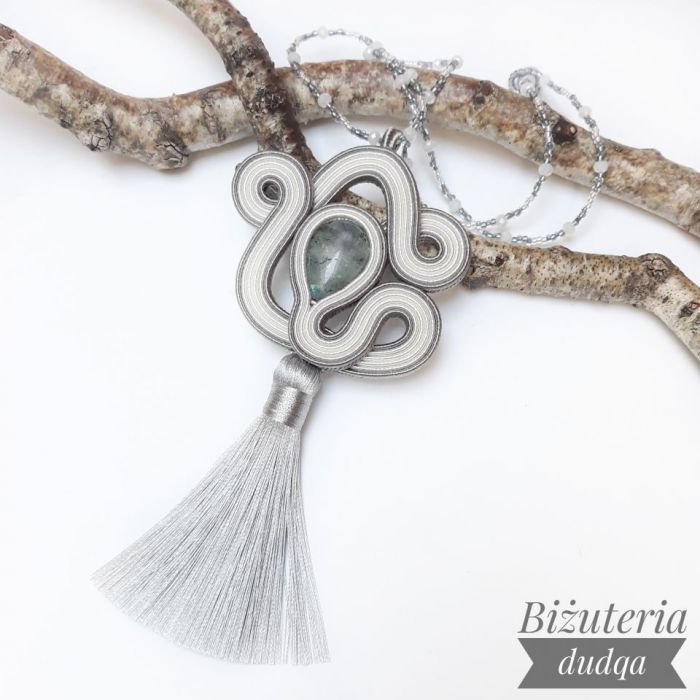 Wisior wykonany w technice haftu sutasz z wykorzystaniem sznurka sutasz pochodzącego z Grecji, jest dużo bardziej mięsisty i sztywny. Centrum to lsbladoryt, całość podszyta ekoskora i zawieszona na sznurze z koralików.