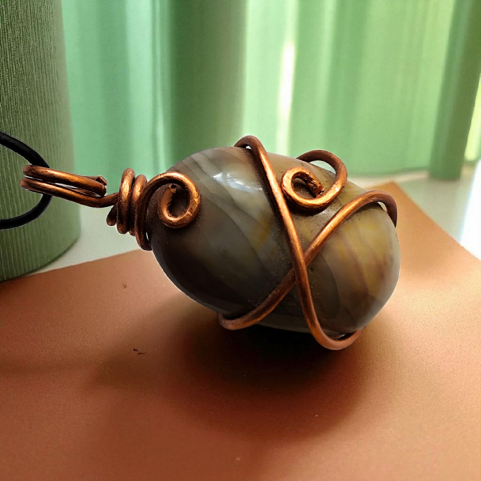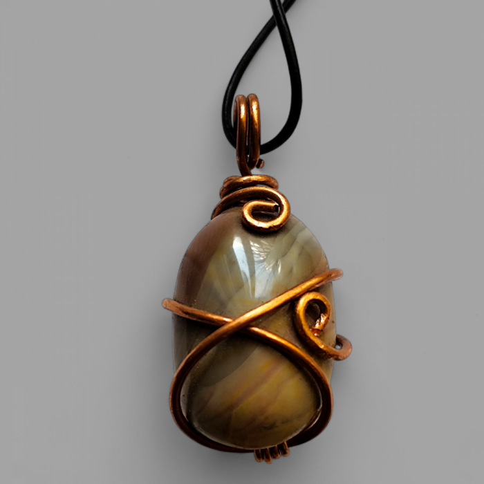 Kamień został otulony w misternej oprawie z czystej miedzi. Ciepły blask metalu doskonale podkreśla chłodne barwy jaspisu, a artystyczne zawijasy dodają całości charakteru i tajemniczości. To nie tylko ozdoba, ale amulet, który łączy w sobie energię ziemi i wody.