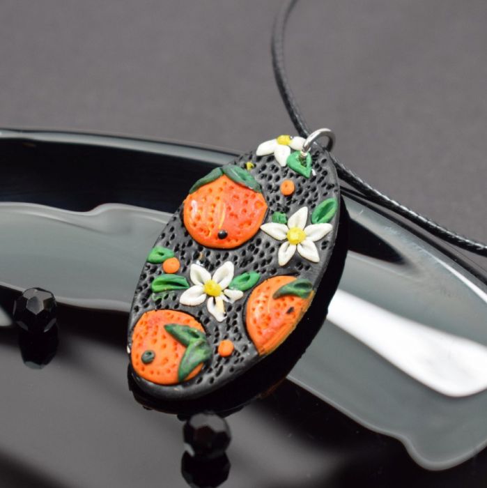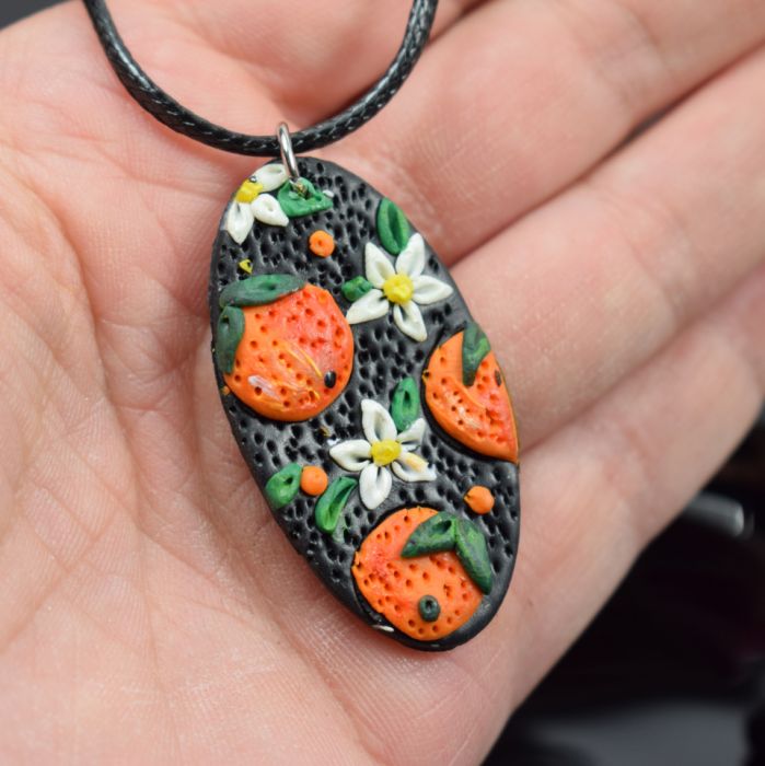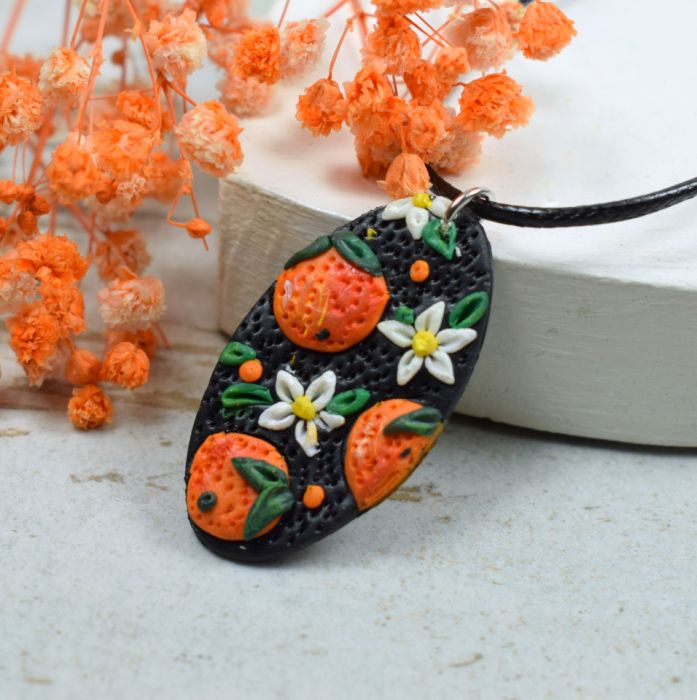 Letni, radosny wisiorek z ręcznie wykonanym elementem z glinki polimerowej, przedstawiającym soczyste pomarańcze. Wyrazisty, kolorowy akcent, który przyciąga uwagę i dodaje świeżości każdej stylizacji.