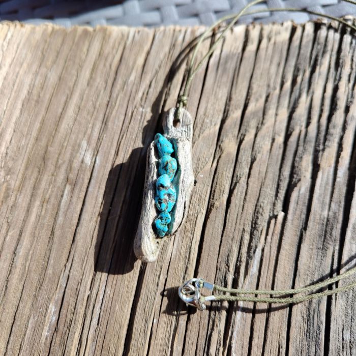 Ten piękny wisiorek został wykonany w technice driftwood, czyli z naturalnego, wyrzuconego na brzeg morza Bałtyckiego drewienka. Każdy egzemplarz jest unikalny, bo opowiada swoją własną, morską historię. Drewienko zdobią delikatne turkusowe kamyczki, które dodają mu świeżości i odrobiny morskiego klimatu. Całość zawieszona jest na miękkim, bawełnianym sznurku, zakończonym praktycznym zapięciem na karabińczyk, dzięki czemu jest wygodny i łatwy w noszeniu. To nie tylko piękna biżuteria, ale też mały kawałek natury, który przypomina o spokojnych spacerach po plaży i morskiej magii.