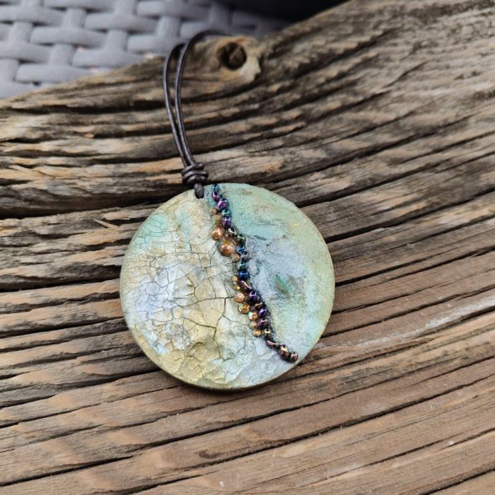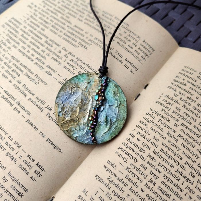 Ten unikatowy wisiorek ręcznie wykonany zachwyca swoją organiczną formą i głęboką symboliką. Okrągła zawieszka w odcieniach patynowanej zieleni, złota i srebrzystych przetarć przypomina spękaną powierzchnię ziemi lub starożytną mapę ukrytą w czasie. Przez środek biegnie wyrazista linia z drobnych, metalicznie połyskujących koralików w odcieniach fioletu, granatu i turkusu, przywodząca na myśl żyłę minerałów lub rzekę życia przebijającą się przez ląd.