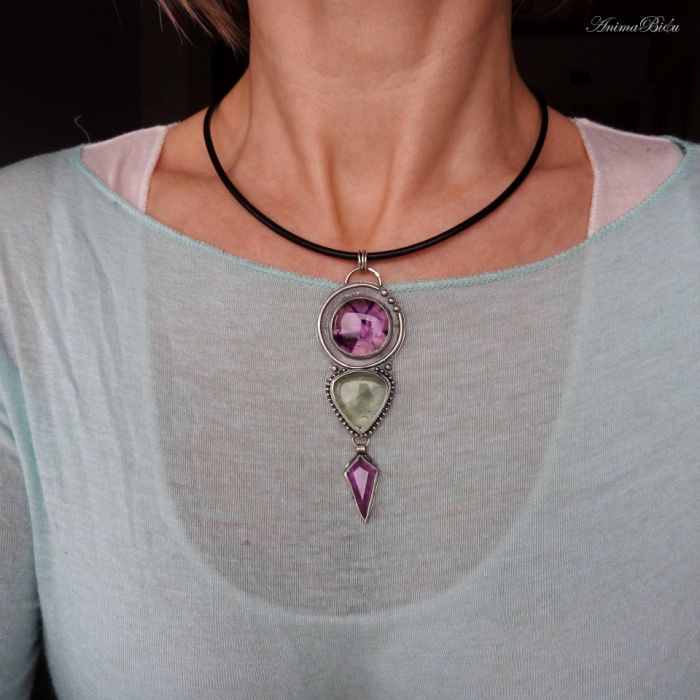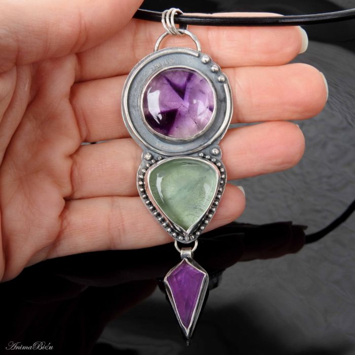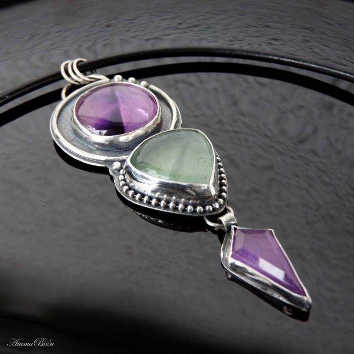Wisiorek srebrny z ametystem i fluorytem. Wykonałam go od podstaw ręcznie ze srebra próby 925 i 999, które dla uwypuklenia zdobień przyciemniłam i starannie wypolerowałam. Na ozdobę składają się trzy minerały. Od góry umieściłam bardzo ciekawy, okrągły okaz ametystu gwiaździstego, poniżej gruby trójkącik seledynowego fluorytu, a na samym dole przywiesiłam ostro zakończony ametyst o interesującym szlifie. Całość stanowi niebanalną ozdobę, która uświetni niejedną stylizację. Kamienie mają w sobie naturalnie występujące spękania i inkluzje. Wisiorek ma długość 91 milimetrów, a w najszerszym miejscu ma 31 mm, waga całości wynosi 21,6 gramów, z czego srebro stanowi 11,6 g. Do wyrobu użyłam techniki lutowania i młotkowania. Do wisiorka dołączam naturalny, czarny, sztywny rzemień długości 45 cm ze srebrnym zapięciem (próba925) widoczny na zdjęciach. Wisior został ocechowany w Urzędzie Probierczym.