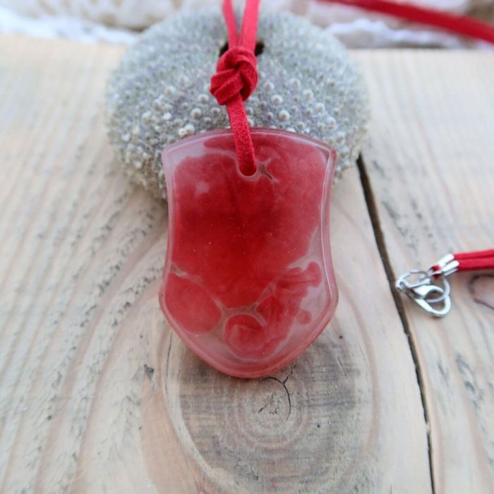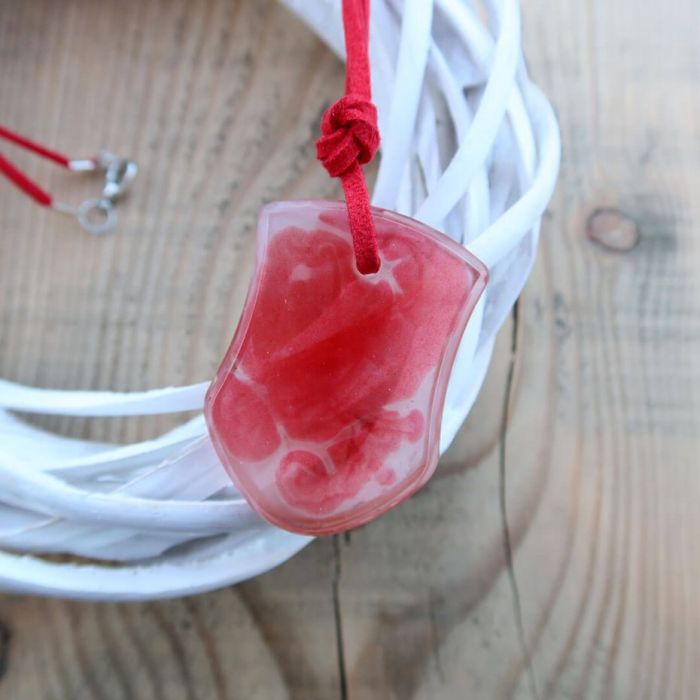 Zawieszony na czerwonym rzemyku, staje się jeszcze bardziej wyrazisty i oryginalny. Kontrast między intensywnym malinowym kolorem a jaskrawym czerwienią rzemyka sprawia, że całość prezentuje się gustownie i stylowo.