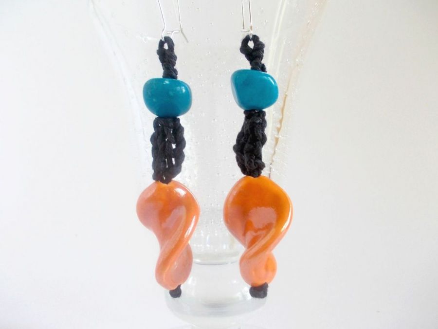 Głównym elementem dekoracyjnym każdego z tych kolczyków jest oryginalny pomarańczowy spiralny koral ceramiczny, zestawiony z mniejszym koralikiem o nieregularnych kształtach w kolorze ciemnego turkusu. Całość połączona jest elementami szydełkowanymi z czarnego woskowanego bawełnianego sznurka (gr. 1 mm).