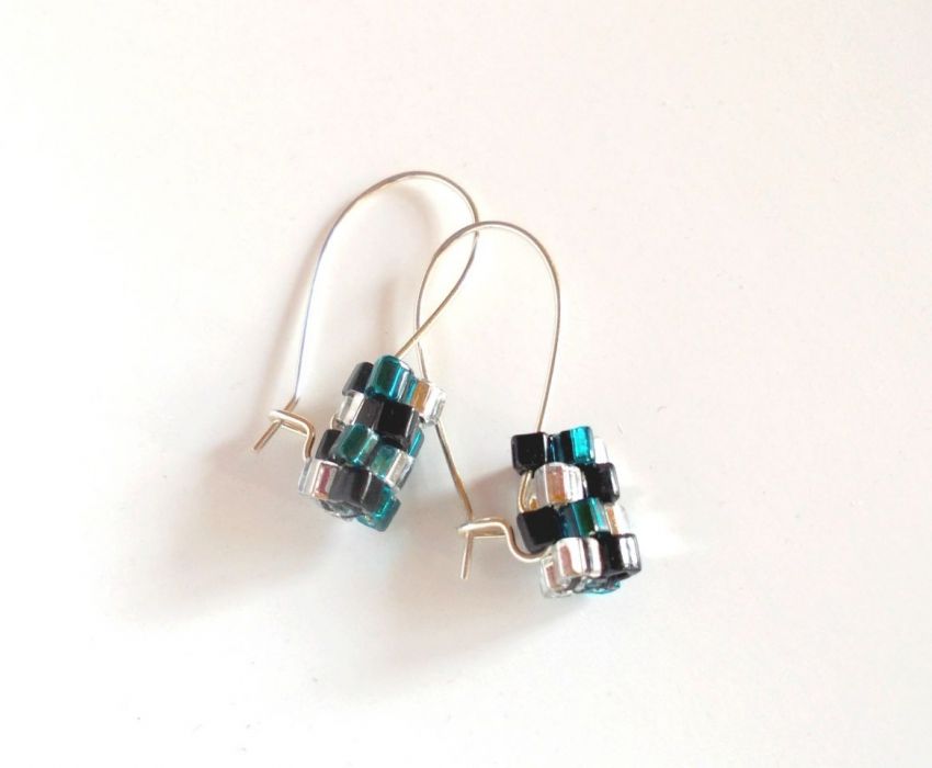 Kolczyki te są wykonane ze szklanych japońskich koralików Toho Cube Black, Toho Cube Silver Lined Teal i Toho Cube Silver Lined Crystal. Koraliki tworzą mały dekoracyjny cylinder (wymiary cylindra 1,1 x 0,8cm). Długość całego kolczyka (z biglem) to 3,2cm.