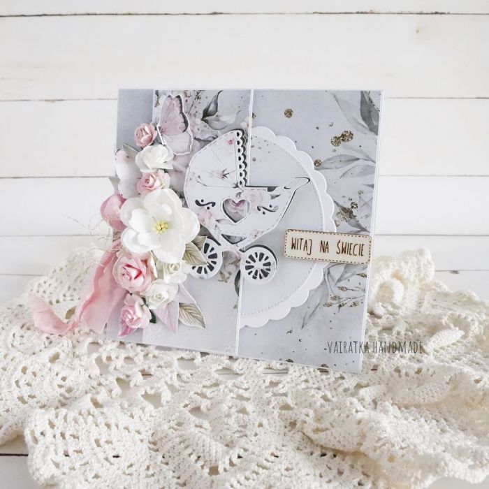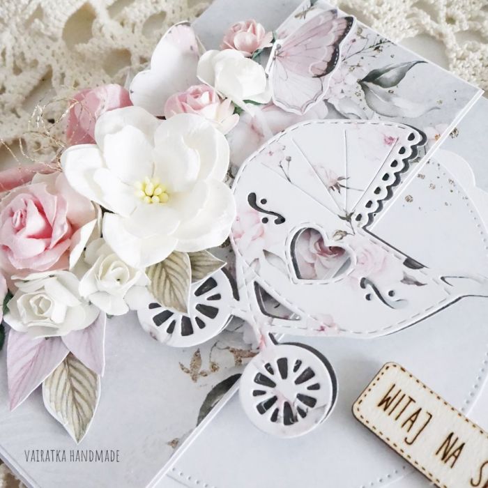 Wyjątkowa i niepowtarzalna kartka gratulacyjna z okazji narodzin dziewczynki. Ozdobiona bogatą kompozycją papierowych kwiatów, listków, elementów papierowych.