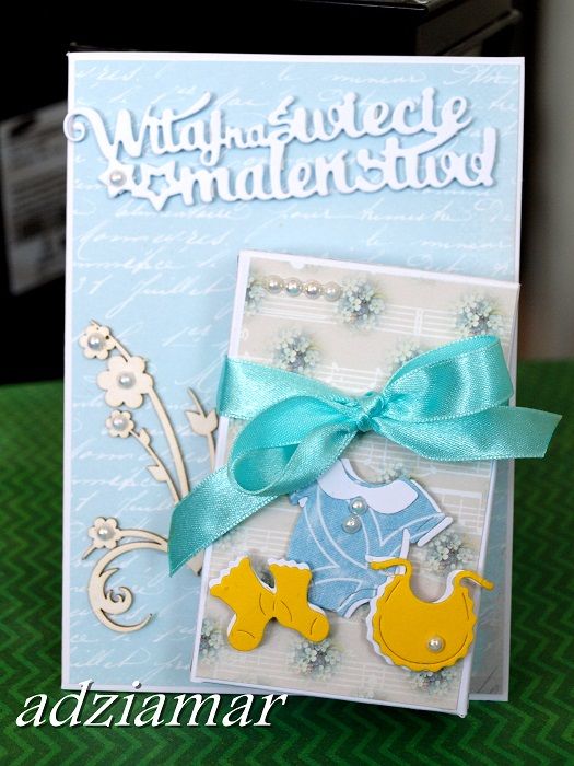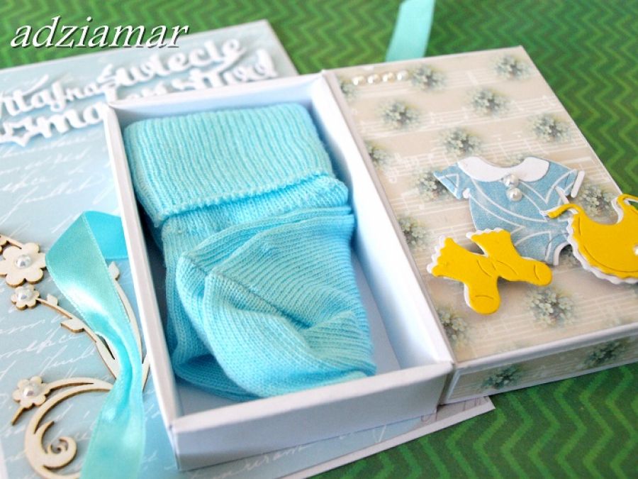 Kartka ręcznie robiona z okazji narodzin,przestrzenna. Materiały wysokiej jakości. Format 10,5x14,8cm. Z pudełkiem, w którym znajdują się skarpetki dla malucha.