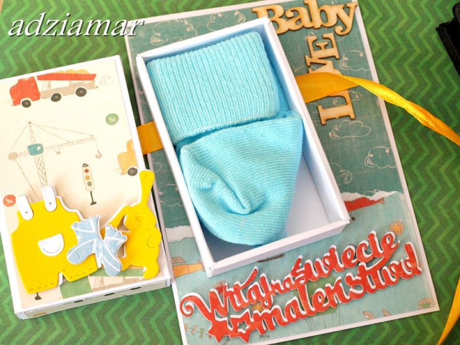 Kartka ręcznie robiona z okazji narodzin,przestrzenna. Materiały wysokiej jakości. Format 10,5x14,8cm. Z pudełkiem, w którym znajdują się skarpetki dla malucha.