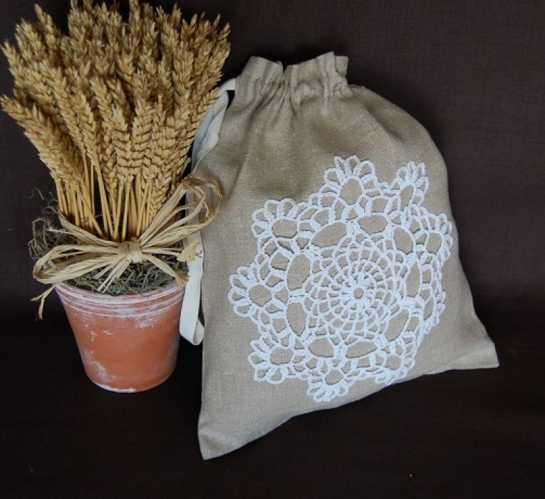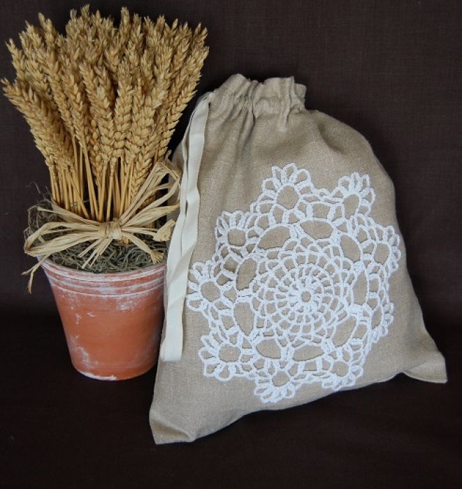 Woreczek "Zapach Prowansji"- woreczek wykonany z 100% lnu w kolorze jasnoszarym, ozdobiony na przodzie szydełkową serwetką dodającą mu prowansalskiego, rustykalnego stylu. Ściągany z jednej strony na bawełnianą tasiemkę. Może pełnić zarówno funkcję ozdobną jak i praktyczną służąc jako woreczek do przechowywania żywności lub drobiazgów.