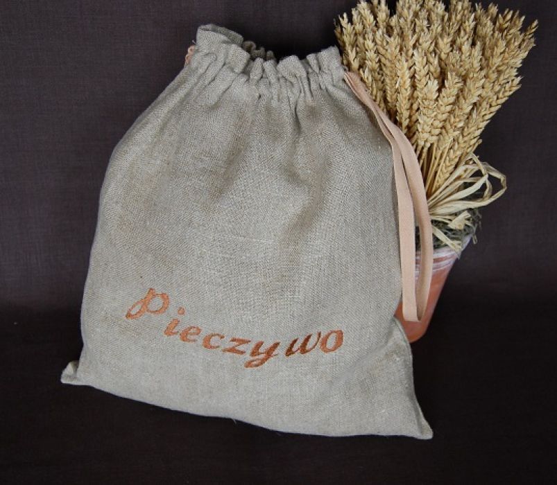 Worek na pieczywo wykonany z naturalnego lnu, z wyhaftowanym brązowym napisem "Pieczywo". Ściągany z dwóch stron na bawełnianą tasiemkę. Len jako włókno naturalne, przepuszczające powietrze idealnie nadaje się do przechowywania produktów spożywczych.