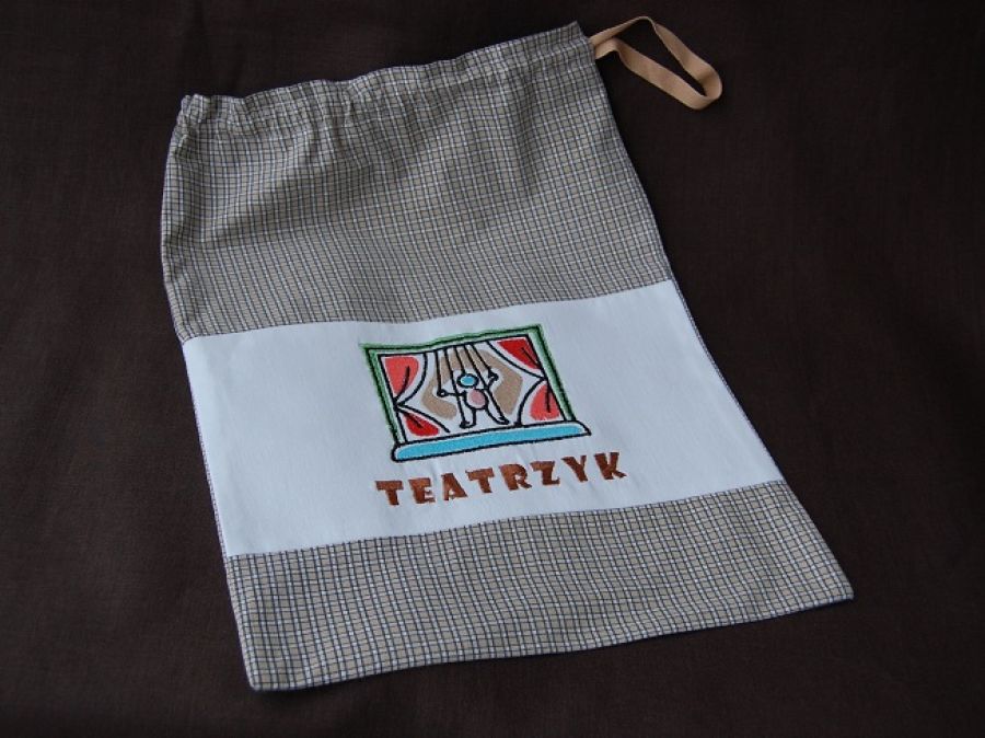 Worek na zabawki - worek do przechowywania zabawek - teatrzyku. Wykonany z beżowej tkaniny w krateczkę, na bawełnianej wstawce wyhaftowany teatrzyk. Na górze tunel, a w środku bawełniana tasiemka ściągająca woreczek.