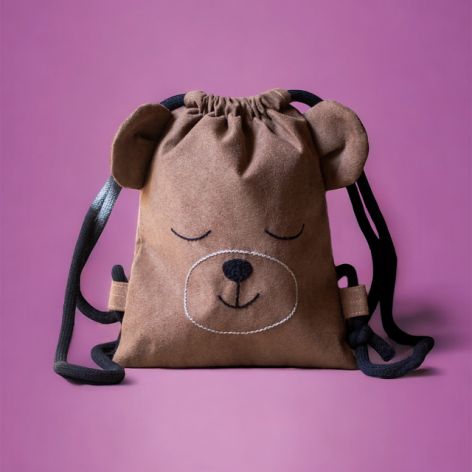 Dziecięcy plecaczek worek wykonany z brązowego nubuku. Ręcznie haftowany pyszczek misia. Bawełniane sznurki w kolorze czarnym.