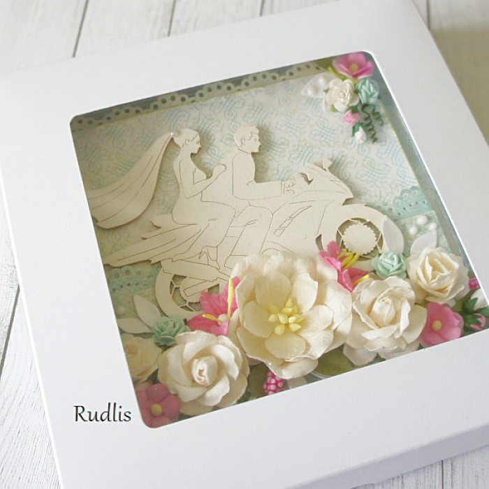 Ozdobę stanowi delikatna tekturka przedstawiająca młodą parę na motorze oraz bogaty bukiet kwiatów.