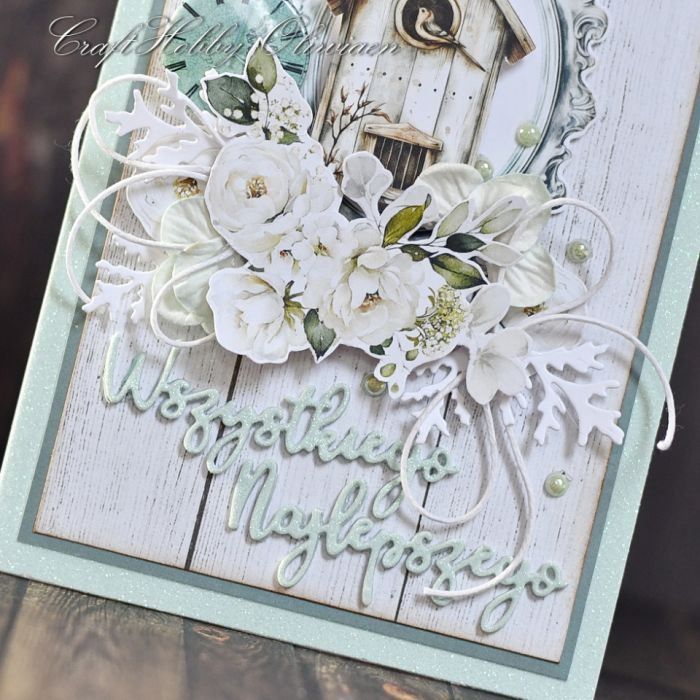 Wykonana z bezkwasowych papierów do scrapbookingu, ozdobiona motywami wyciętymi z papieru, kompozycja kwiatową z dodatkiem hortensji mulberry, buttonem z motywem zegara, sznureczkiem i perełkami.
