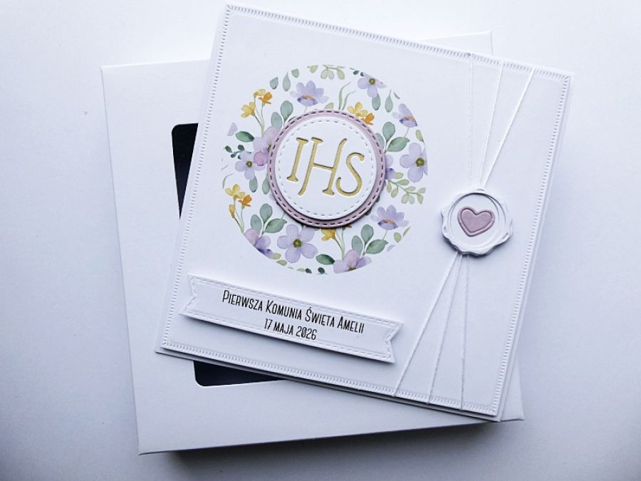 Wyjątkowa kartka na Pierwszą Komunię Świętą w komplecie z ozdobnym białym pudełkiem z szybką - skromna i subtelna, ale pełna wdzięku.