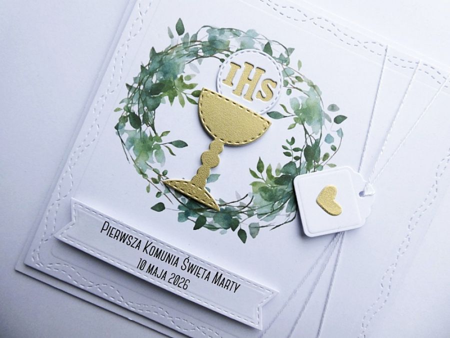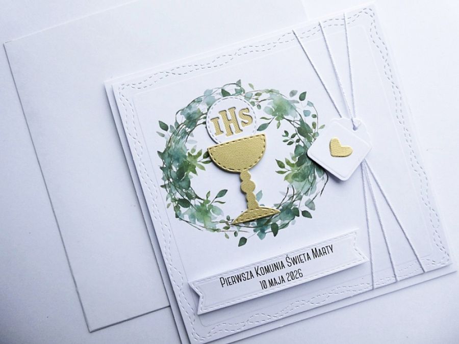Przyozdobiona piękną grafiką z motywem wianka oraz złocistym kielichem z Hostią, który nawiązuje do religijnego charakteru uroczystości.