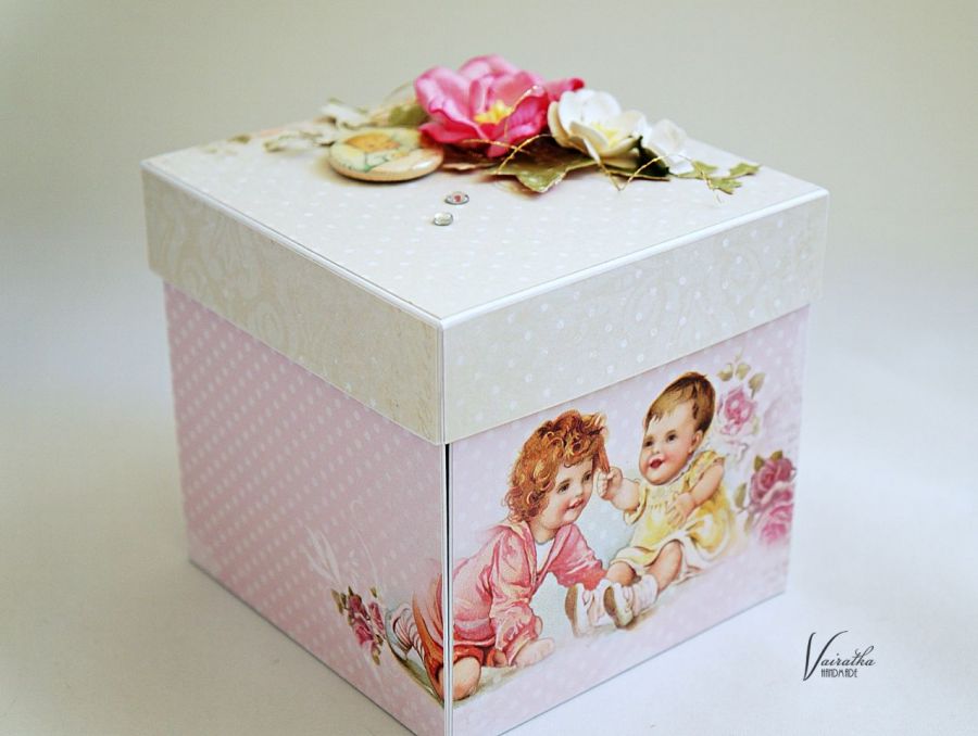 Elegancki prezent chrzecielny w postaci "eksplodującego" pudełka - zamknięte - to z pozoru zwykłe pudełko - po zdjęciu wieczka ścianki rozkładają się i ukazuje się zaskakujące wnętrze :)