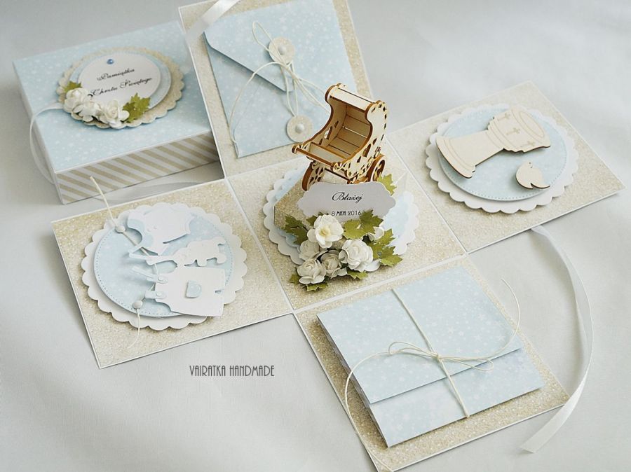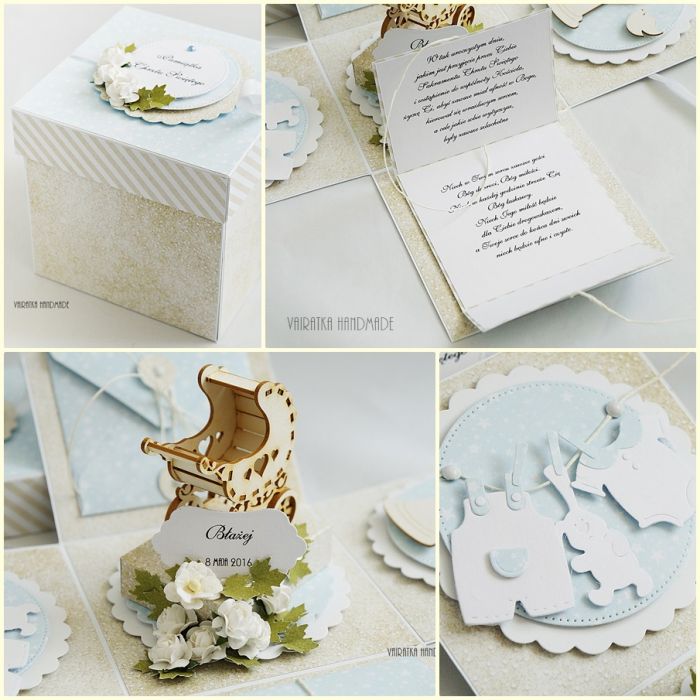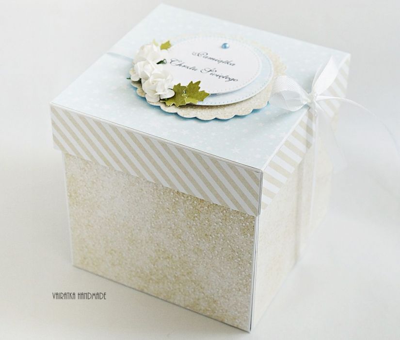 Elegancki prezent chrzcielny w postaci "eksplodującego" pudełka - zamknięte - to z pozoru zwykłe pudełko - po zdjęciu wieczka ścianki rozkładają się i ukazuje się zaskakujące wnętrze :)