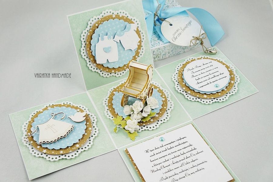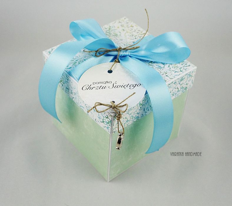 Elegancki prezent chrzecielny w postaci "eksplodującego" pudełka - zamknięte - to z pozoru zwykłe pudełko - po zdjęciu wieczka ścianki rozkładają się i ukazuje się zaskakujące wnętrze :)