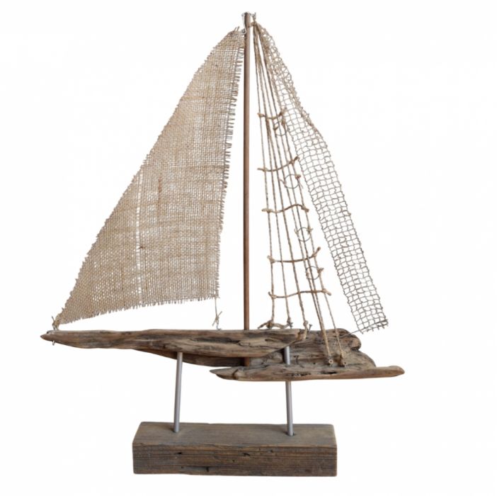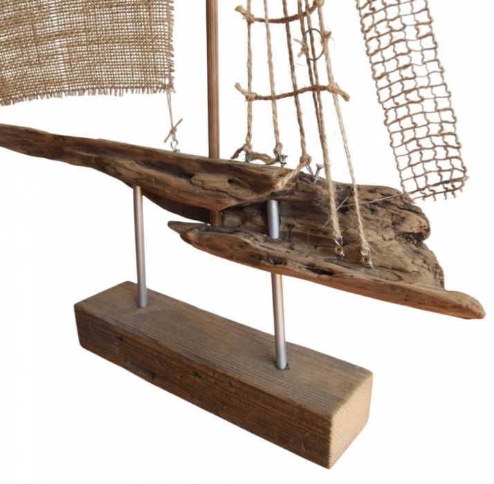 Żaglowiec, a raczej interpretacja żaglowca ;) wykonana ze starego drewna wyrzuconego przez morze, tkaniny jutowej, sznurka jutowego, drutu. Osadzony na podstawce ze starej, drewnianej belki. Niepowtarzalny kształt drewna znalezionego na plaży, nierówności starej belki z otworami po gwoździach czy stare elementy metalowe nadają surowego charakteru i przypominają o historii tych przedmiotów. Seria żaglowców nawiązuje także do filozofii wabi-sabi, stąd wykorzystanie materiałów starych, używanych, "dziwnych", uratowanych przed wyrzuceniem albo wyszukanych wśród staroci czy na bałtyckiej plaży, a niedoskonałość samych (nadżartych czasem) materiałów ma nadawać dekoracjom unikalny charakter.