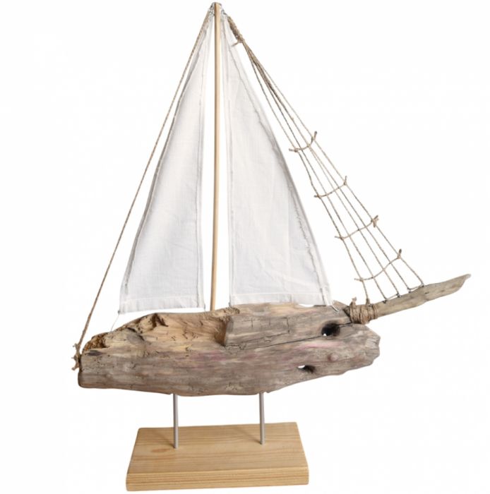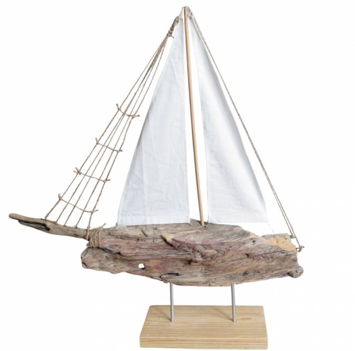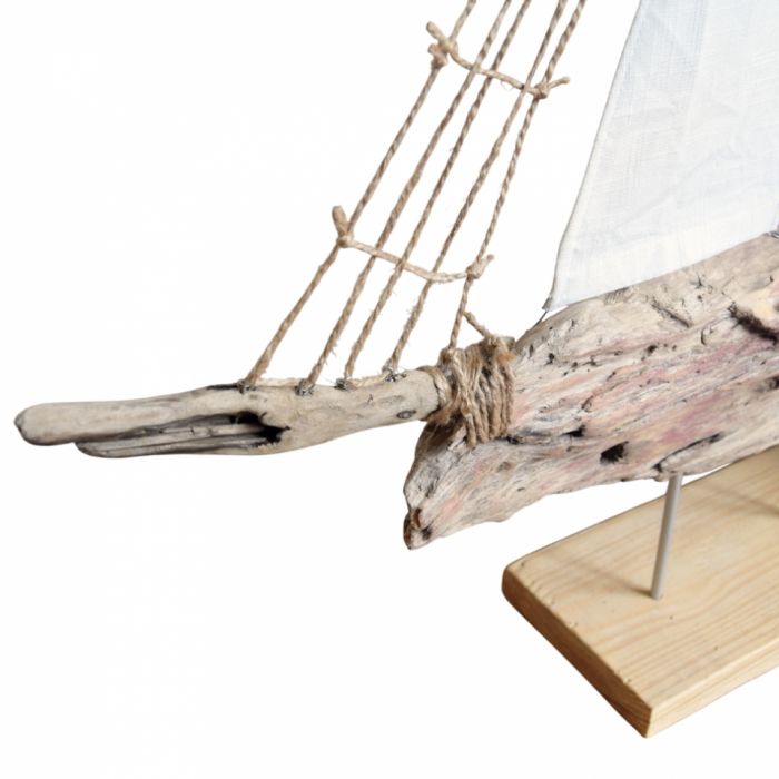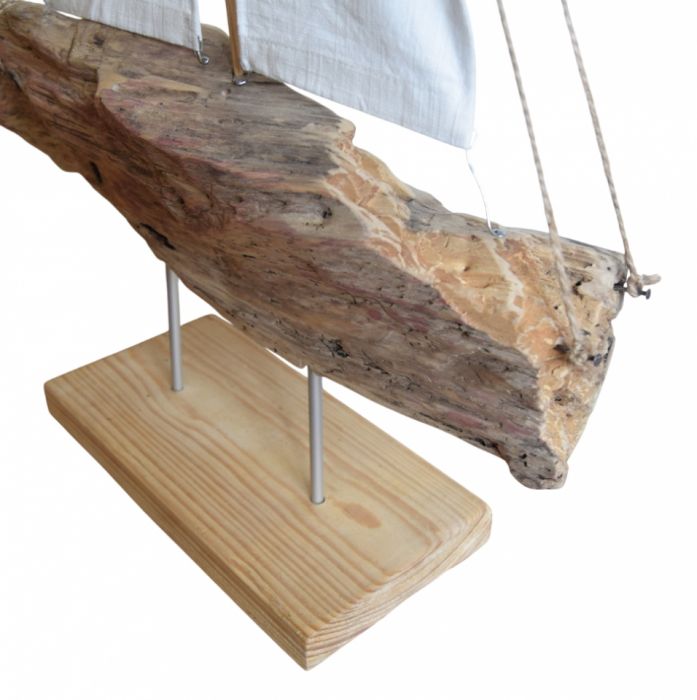 Żaglowiec, a raczej interpretacja żaglowca ;) wykonana ze starego drewna wyrzuconego przez morze, tkaniny bawełnianej, sznurka jutowego, starych gwoździ oraz drutu. Osadzony na podstawce z deski sosnowej. Seria żaglowców nawiązuje do filozofii wabi-sabi, stąd wykorzystanie materiałów starych, używanych, "dziwnych", uratowanych przed wyrzuceniem albo wyszukanych wśród staroci czy na bałtyckiej plaży, a niedoskonałość samych (nadżartych czasem) materiałów oraz niepowtarzalny kształt drewna znalezionego na plaży nadaje dekoracjom unikalny charakter.
