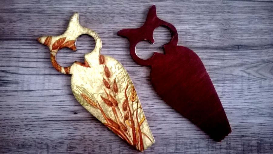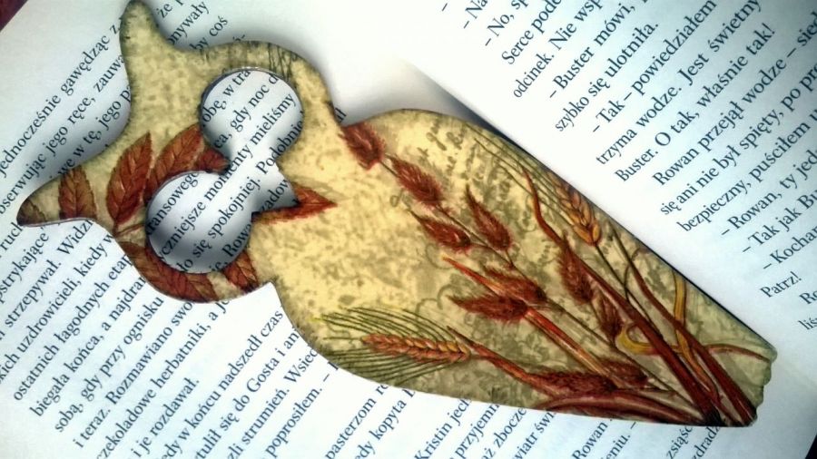 Śliczna zakładka do książki z cieniutkiej sklejki drewnianej ozdobiona metodą decoupage, druga strona bejcowana palisandrem, malowana, szlifowana, gładzona i lakierowana.