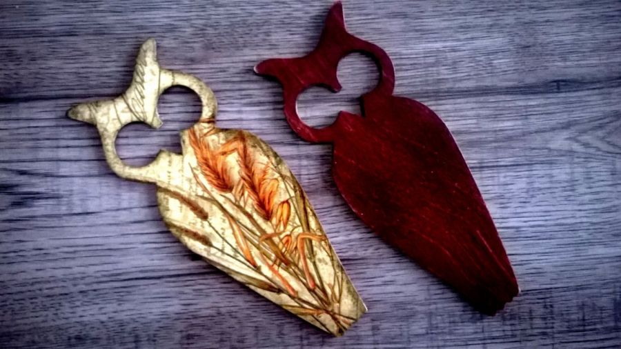 Śliczna zakładka do książki z cieniutkiej sklejki drewnianej ozdobiona metodą decoupage, druga strona bejcowana palisandrem, malowana, szlifowana, gładzona i lakierowana.
