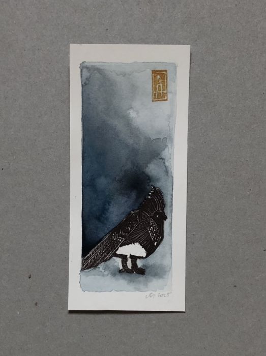 Zakładka wykonana na papierze bezkwasowym (300g/m2), tło podmalowane akwarelą, powierzchnia została zabezpieczona fiksatywą.