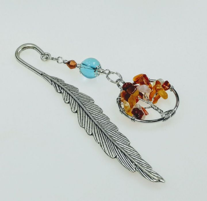 Zakładka wykonana z elementów metalowych oraz zawieszki z kamykami karneolu.