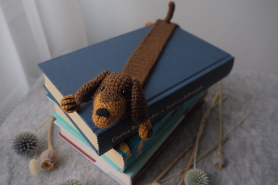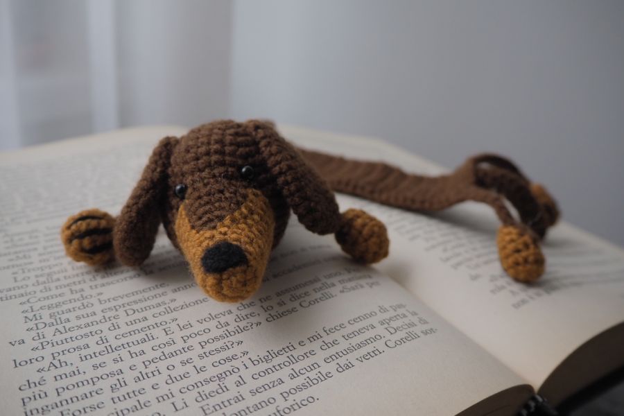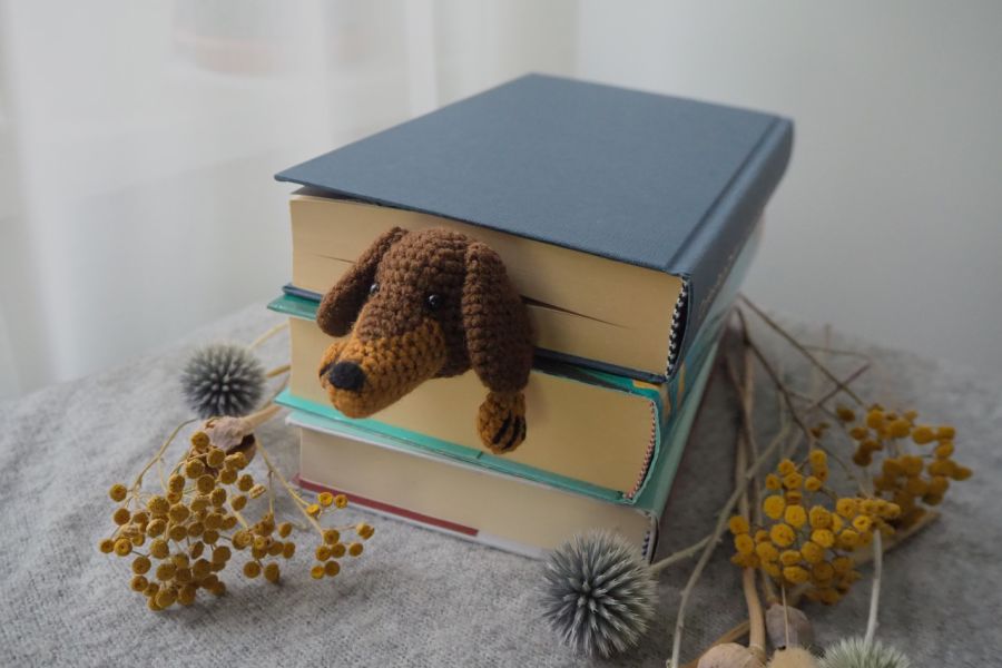 Zakładka do książki z sympatycznym pieskiem wykonana z włóczki na szydełku.
