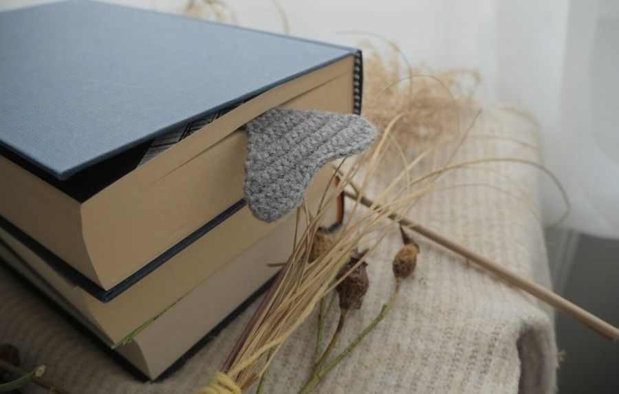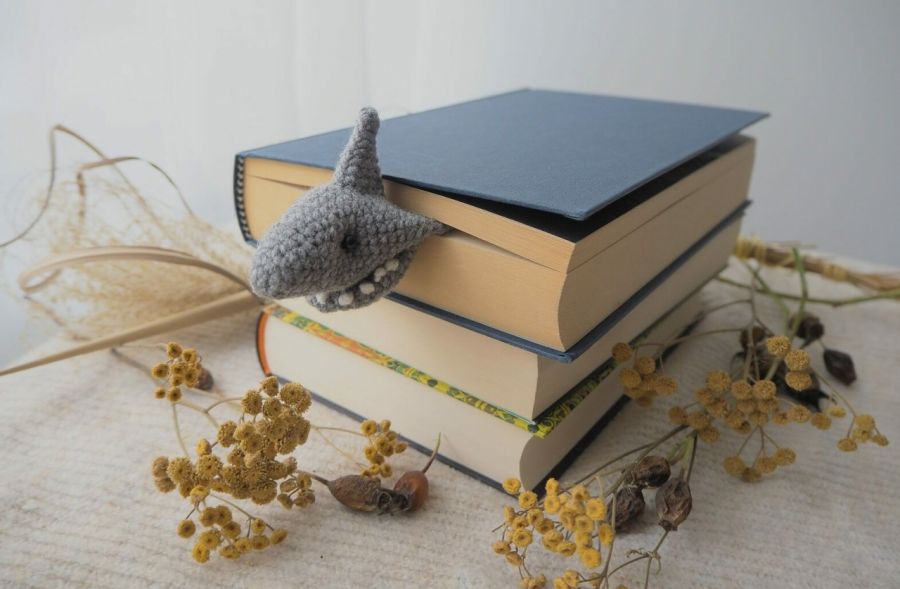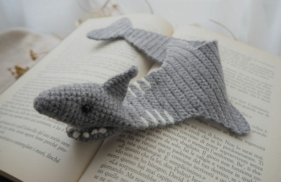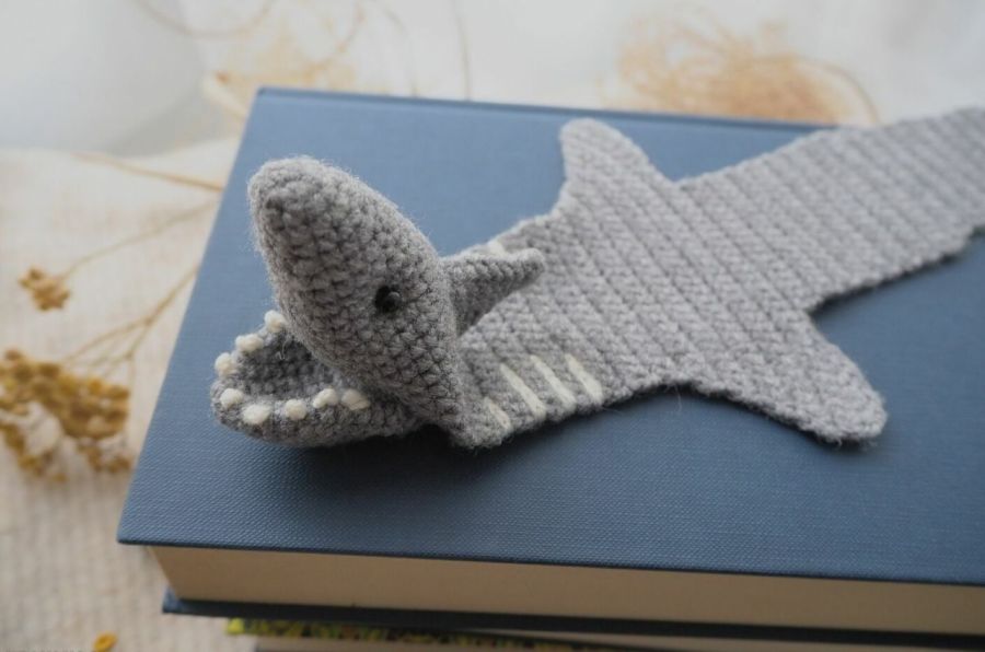 Zakładka do książki z sympatycznym rekinkiem wykonana z włóczki na szydełku.