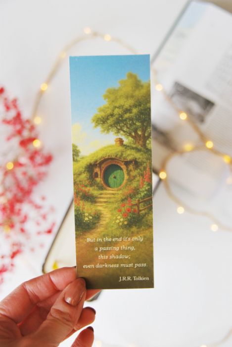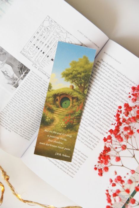 Ta elegancka papierowa zakładka inspirowana Władcą Pierścieni to idealny dodatek dla miłośników twórczości Tolkiena. Na jednej stronie znajduje się minimalistyczna grafika z kultowym Jedynym Pierścieniem oraz klasycznym tytułem sagi, a na drugiej – nastrojowa ilustracja urokliwego Shire wraz z motywującym cytatem: