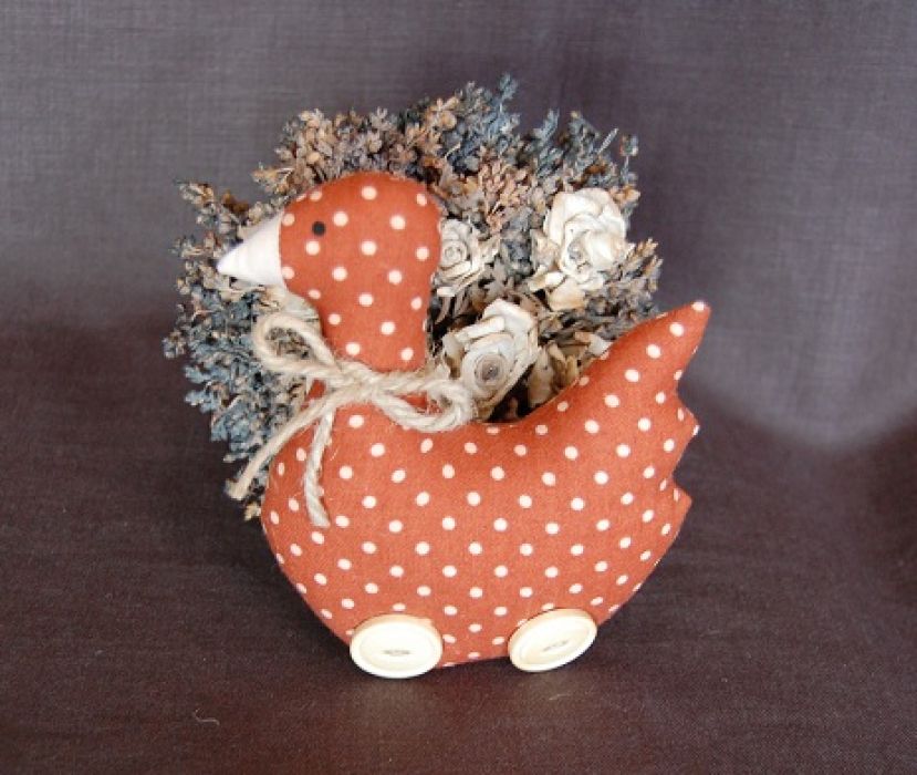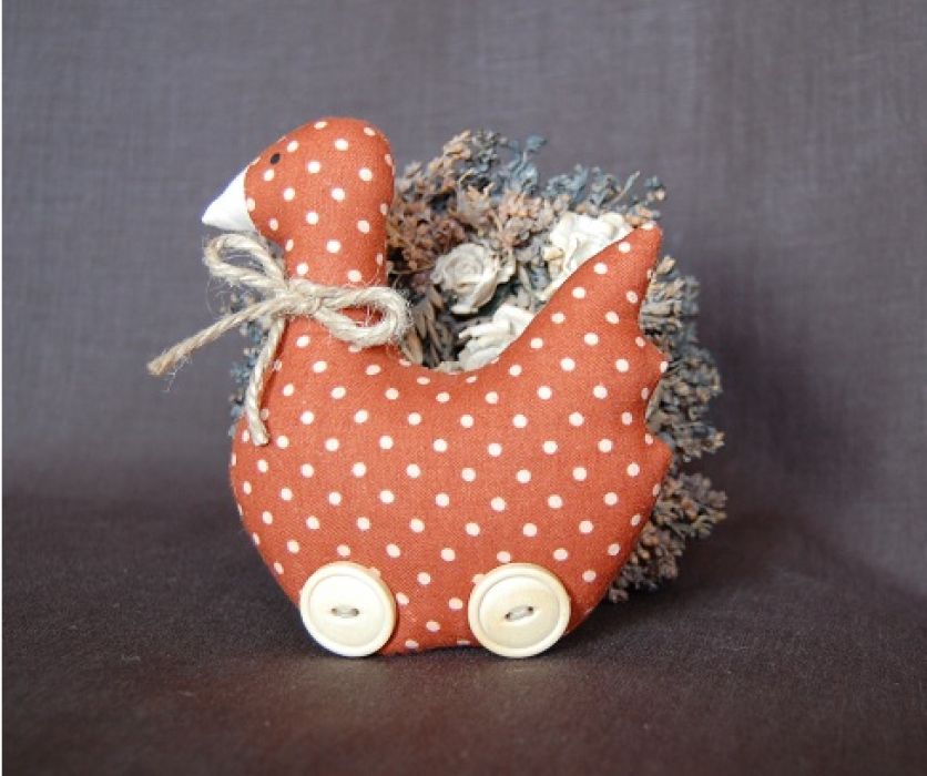 Tildowa gąska wykonana z tkanin bawełnianych. Wypełniona kulką silikonową. Na szyi, dodająca wdzięku kokardka ze sznura jutowego. Oczka malowane czarną farbą do tkanin. Gąska osadzona została na czterech drewnianych "wrotkach" wykonanych z drewnianych guzików - sprawia to, że ozdoba sama stoi.