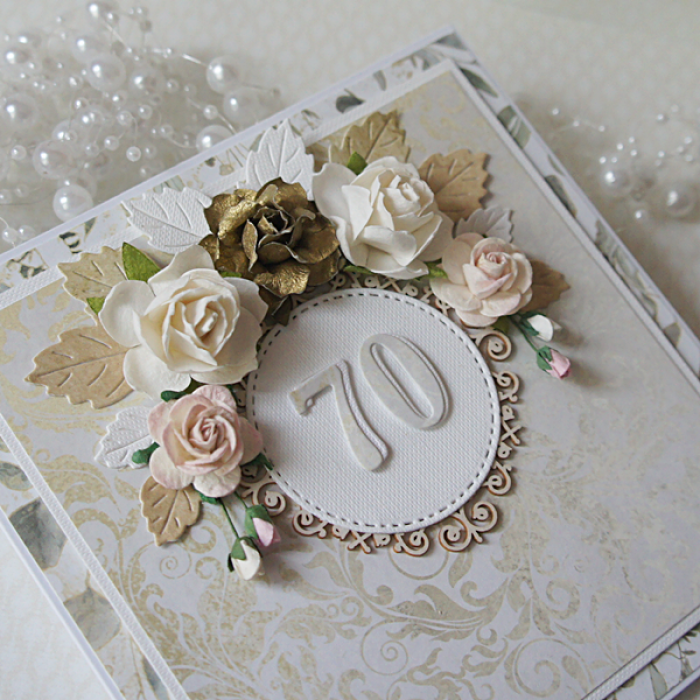 Kartka wykonana z wykorzystaniem profesjonalnych materiałów i dodatków. Ozdobiona pięknym, eleganckim papierem w tonacji beżowo-białej, tekturową ramką, przestrzennym bukietem kwiatów w tonacji beżowo-różowej z jedną złotą różą.