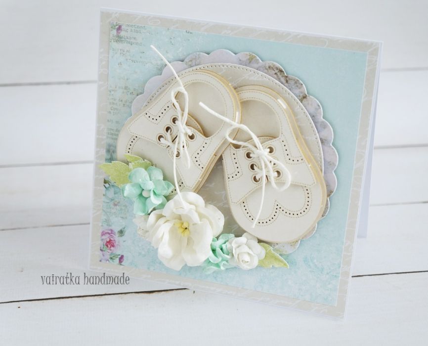 Delikatna kartka - na powitanie maluszka na świecie - w pudełku. Głównym motywem są urocze chłopięce buciki okolone bukietem papierowych kwiatów i listków. Wszystkie elementy podklejone kosteczkami 3d, dzięki czemu kartka jest bardzo przestrzenna. Razem z pasującym pudełkiem stanowi idealny prezent - lub dodatek do prezentu.