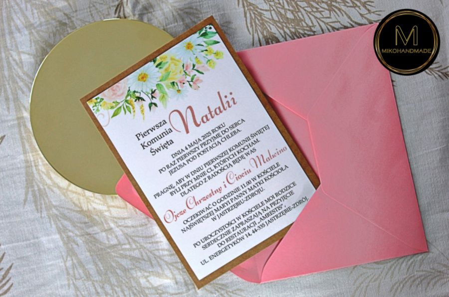 - Grafika: zaproszenie ozdobione jest motywem wiosennych kwiatów, odpowiednim na tę podniosłą okazję.
