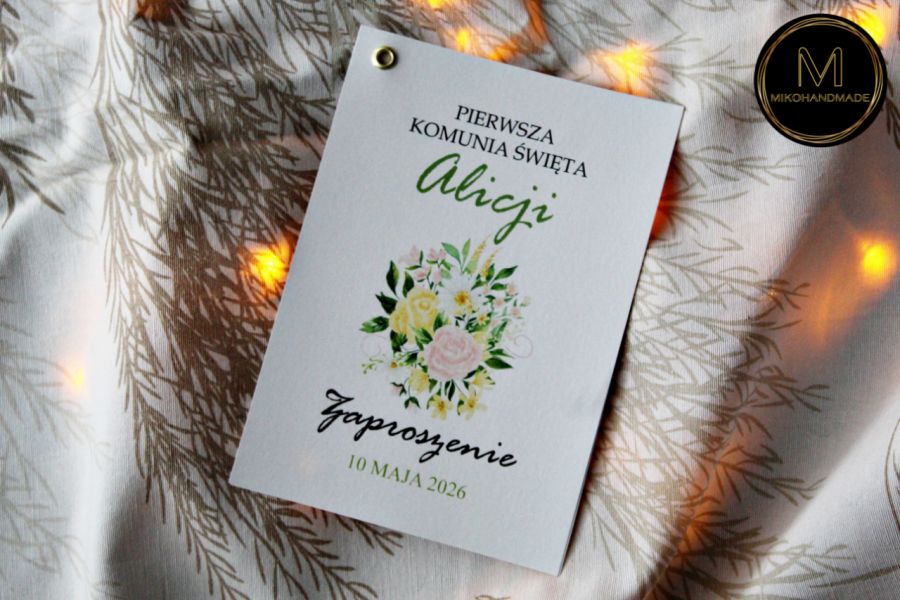 Prezentujemy wyjątkowe, ręcznie projektowane zaproszenie na uroczystość Pierwszej Komunii Świętej, stworzone z myślą o wyjątkowym dniu Twojej córki.