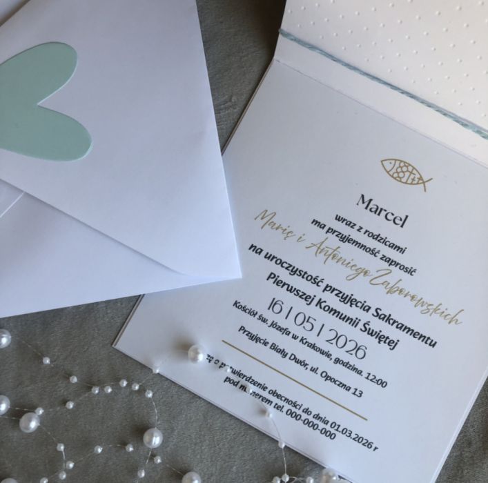 Stylowe, otwierane zaproszenie na Komunię Świętą zaprojektowane specjalnie dla chłopca.