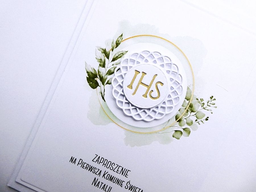 Eleganckie i urokliwe - z niebanalną akwarelową grafiką z motywem liści i Hostią umieszczoną na ozdobnej ażurowej wycinance.