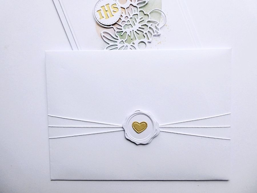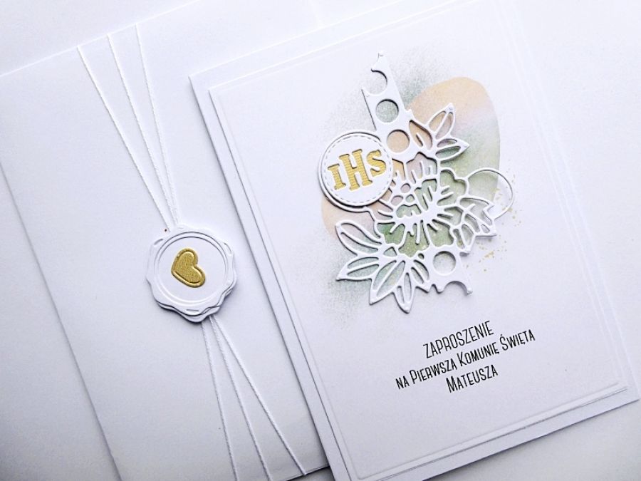 Ręcznie wykonane zaproszenie komunijne w komplecie z ozdobioną kopertą.