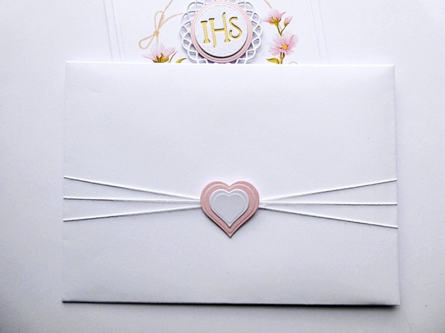 Ręcznie wykonane zaproszenie komunijne w komplecie z ozdobioną kopertą.