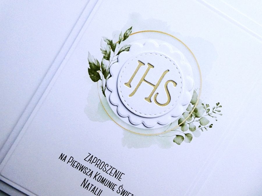 Niezwykle skromne, a zarazem eleganckie - z akwarelową grafiką z motywem liści i hostią umieszczoną na ozdobnej papierowej wycinance.