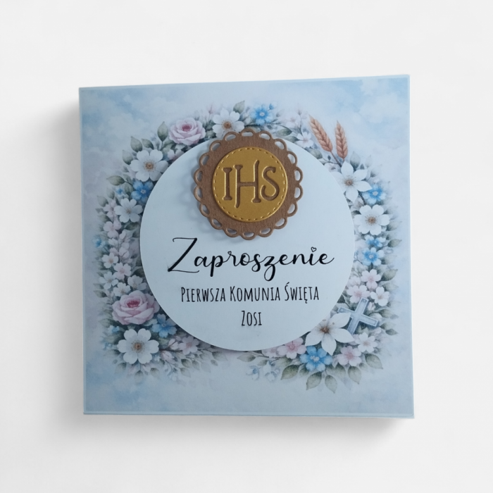 Zaproszenie utrzymane jest w delikatnej, pastelowej kolorystyce z motywem kwiatowym oraz symbolem IHS. Zaproszenie ma uroczysty i sakralny charakter.