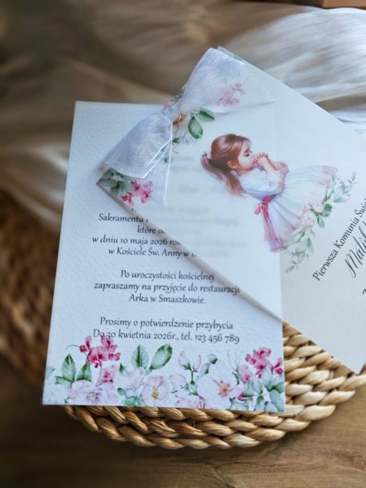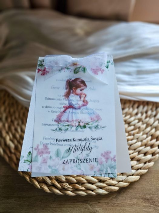 Zaproszenie na Pierwszą Komunię Świętą wykonane z wysokiej jakości, grubego fakturowanego papieru i kalki połączone mitem i wstążką szyfonową