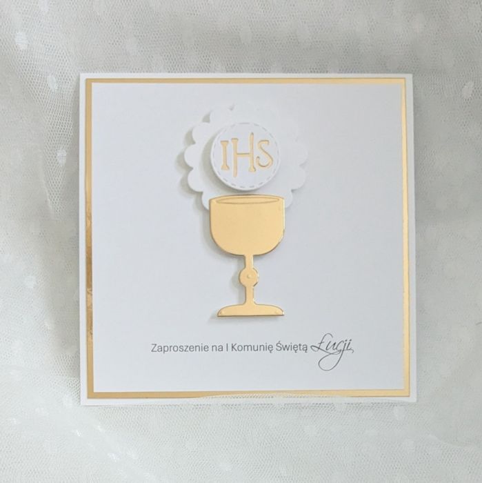 Ręcznie wykonane personalizowane zaproszenie - Pierwsza Komunia Święta, kartka o wymiarze ok 13.5 x 13.5 cm z białą kopertą