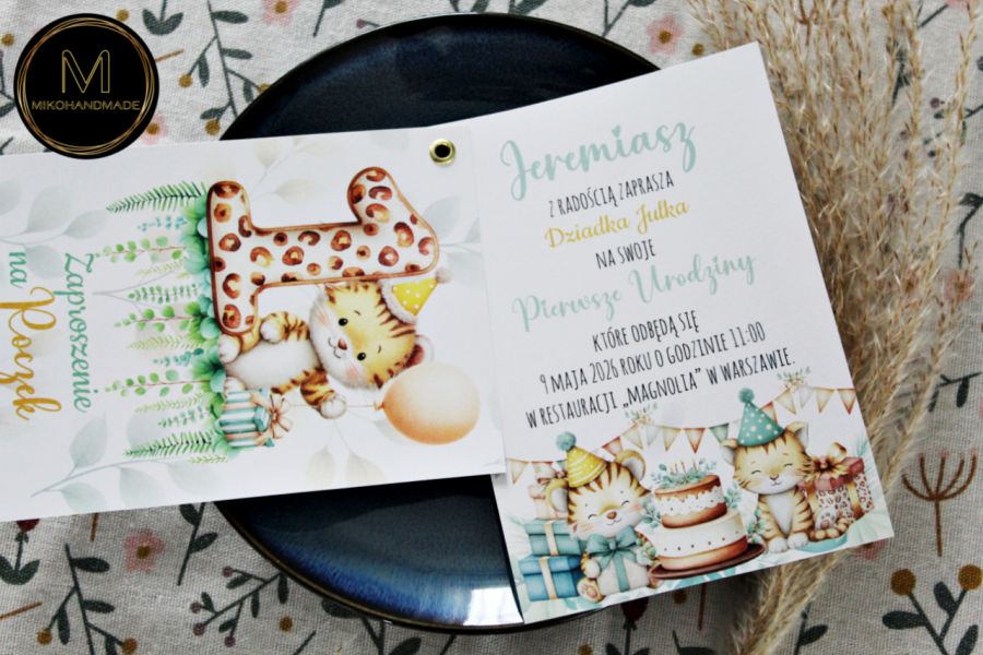 Szukasz wyjątkowego zaproszenia na pierwsze urodziny swojego dziecka? A może na 2., 3., 4. lub 5. urodziny? Zaproszenie z kolekcji Safari z uroczymi tygryskami to idealny wybór na przyjęcie w klimacie zwierzątek z dżungli.