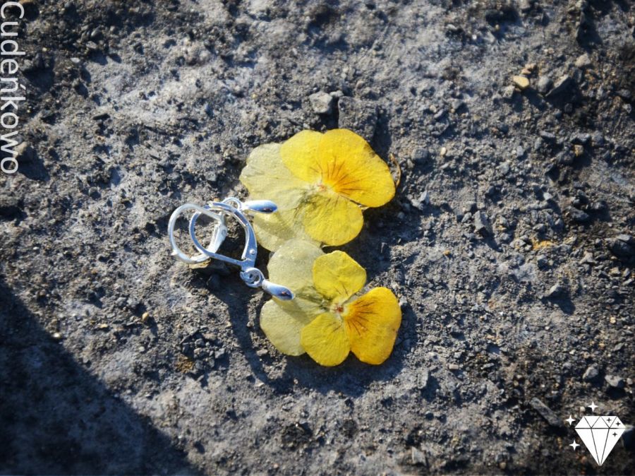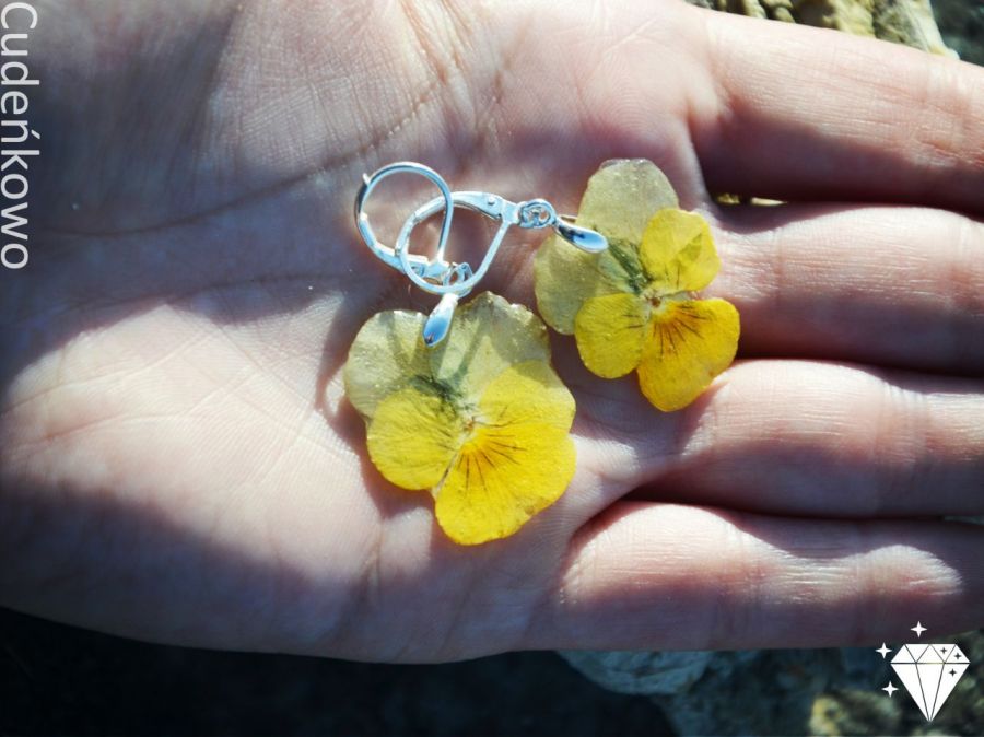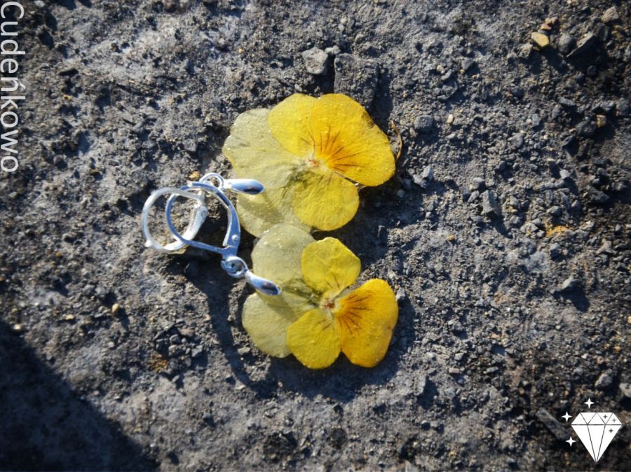 Śliczne kolczyki zostały wykonane z żywicy. Wysuszone kwiaty bratka zostały w niej zatopione. Całości dopełniają srebrne zawieszki, kwiaty zostały zawieszone na srebrnych biglach.