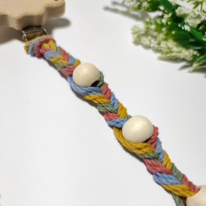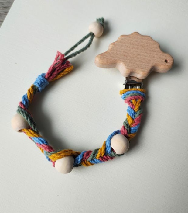 Wykonana ze sznurków bawełnianych z certyfikatem Standard 100 by OEKO-TEX w klasie I (co oznacza, że są bezpieczne i mogą być stosowane w produktach dla niemowląt i dzieci do lat 3) i klipsa z nielakierowanego drewna bukowego.